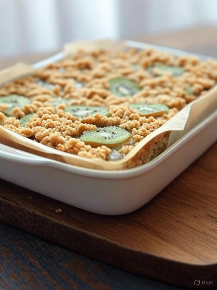 - Sprinkle the remaining crumble mixture evenly over the kiwi filling, pressing lightly to adhere.